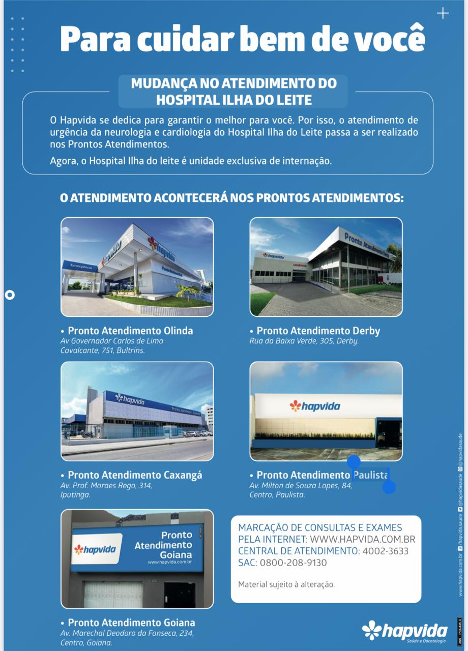 A Hapvida está alterando o funcionamento do Hospital Ilha do Leite para garantir a qualidade dos seus procedimentos aos clientes. Agora, os atendimentos do hospital passarão a ser feitos nas unidades de Pronto Atendimento e o Hospital Ilha do Leite será unidade exclusiva para internações.